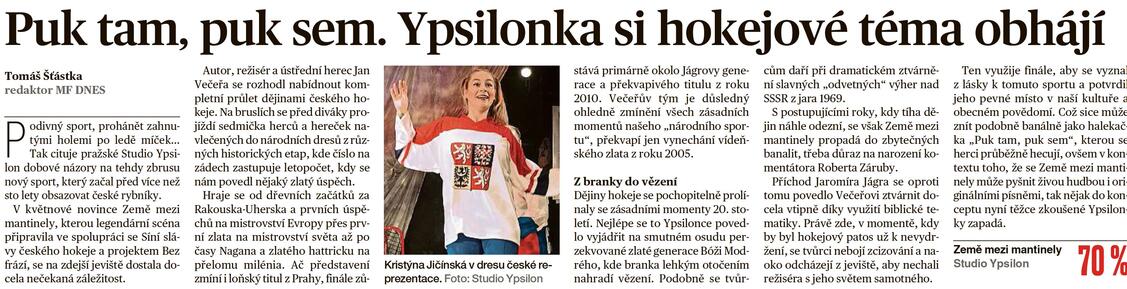 „90 %. Já hokej nesleduji, necítím žádnou sounáležitost s českými hráči ani s nikým, kdo hokej sleduje. Ale i tak se mi tato inscenace moc líbila. Ono to totiž vlastně vůbec není o hokeji, je to příběh jednoho národa, který měl hokej jako formu boje. Je to o sdílené vášni. A taky je to hezké a moderní pokračování v tradici divadla Ypsilon. Charismatičtí herci tu hrají sami za sebe, reagují na aktuální publikum a chtějí mu předat něco, co je pro ně důležité. Tak to má být.“ (Šípal, i-divadlo.cz, 30. 5. 2025)